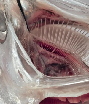 “Durante a ingestão dos alimentos, a água flui pela parede permeável do funil, é filtrada e a água livre de partículas retorna ao meio ambiente pelas brânquias”, explica Blank. “No entanto, o plâncton é grande demais para isso; fica preso pela estrutura natural da peneira. Graças ao formato do funil, ele rola em direção à garganta, onde é recolhido até que o peixe o engula, o que esvazia e limpa o sistema.”