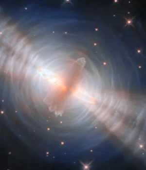 Dois raios brilhantes saem da estrela, iluminando lóbulos polares em movimento rápido que perfuram anéis de material mais antigos e mais lentos, dispostos em arcos concêntricos. A estrutura e o movimento destas características apontam para uma possível influência gravitacional de uma ou mais estrelas companheiras invisíveis, escondidas dentro de um denso disco de poeira.