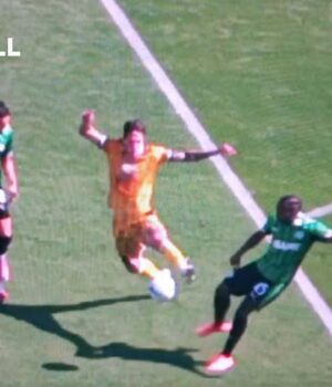 Há uma comunicação entre Lauret e Janiolo na ‘região de penalidade de Nerobardi em 2 27, uma penalidade foi inicialmente aprovada e depois convertida para a falta agressiva por Udinis.