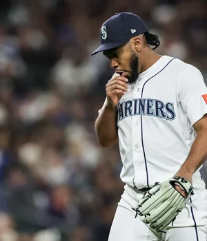 SEATTLE, WASHINGTON – 28 DE MARÇO: Eduard Bazardo # 83 do Seattle Mariners reage após ser retirado durante a sétima entrada contra o Cleveland Guardians no T-Mobile Park em 28 de março de 2026 em Seattle, Washington. (Foto de Olivia Vanney/Getty Images) | Imagens Getty