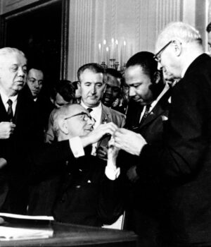 Em 2 de julho de 1964, o presidente Lindon B. Johnson assinou o Congresso pelo Congresso para proibir a discriminação e a separação com base em cores, cores, gênero, religião ou fontes nacionais em um projeto de lei de direitos civis adotado pelo Congresso.