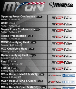 O campeão de domingo nas nações determinará a nova motocracia. Três corridas, incluindo as corridas, serão realizadas duas vezes em cada classe. A primeira corrida começa antes do leste 1 horas como a classe MXGP e a luta da classe MX2. MX 2 + Open e MXGP + Open seguirão. Todos os domingos, a Moto promoverá diretamente a CBS Sports Network com cabo ou serviço como a TV do YouTube. O programa de streaming da temporada regular do MXGP começará com o MXGP-TV no sábado com uma conferência de imprensa e uma cobertura de transmissão em todos os fins de semana.