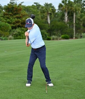 Pegue um bastão ou taco de alinhamento da sua bolsa e coloque-o perpendicularmente à linha alvo a partir do calcanhar interno da guia. Em seguida, pegue seu motorista e segure-o contra o peito, com a ponta do taco apontando para o alvo. Simule uma volta completa no topo do seu backswing, rolando o peito atrás do bastão de alinhamento até que ele toque a perna de fuga (Na foto, acima) Nesta posição “carregada”, deve haver uma separação substancial ou tensão rotacional entre a parte superior e inferior do corpo.