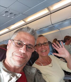 Sara Harding (à direita) após um derrame enquanto fica em casa com seu parceiro Rob Kristen (à esquerda), levou duas horas para chegar a 57