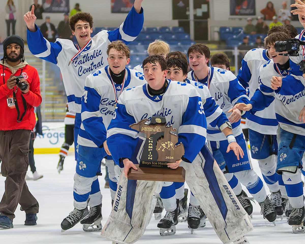 O Detroit Catholic Central vence o campeonato depois de vencer o campeonato estadual de hóquei da Divisão 1 no sábado, 7 de março de 2026, na USA Hockey Arena em Plymouth.