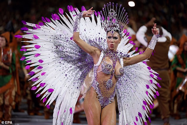 Os desfiles deste ano (na foto, uma artista paulista) celebram uma variedade de temas, incluindo profissionais do sexo, a falecida cantora e compositora brasileira Rita Lee e comunidades negras na Amazônia.