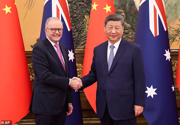 A Austrália é o maior fornecedor de zircônio da China, um mineral essencial para o desenvolvimento militar de Pequim. Foto do primeiro-ministro Anthony Albanese com o presidente chinês Xi Jinping