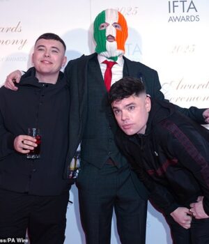 O rap irlandês é o trio nanecap, dizendo que a cobrança de um de seus membros por crimes terroristas no Reino Unido pretende ‘silenciá -los’. Ilustrado: O’Hahana, esquerda, colegas de banda DJ Provou e Moghlai Pai