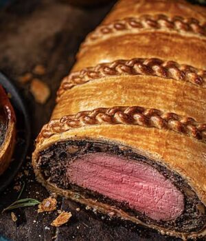 O prato, que serve seis pessoas, é descrito como o ‘derradeiro empecilho da véspera de Natal’ e traz filé de carne, cogumelo portobello e mousse de frango douxelle envolto em massa de manteiga com molho de carne e vinho tinto.
