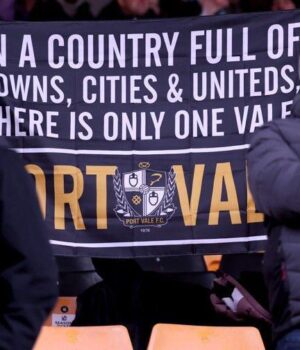 Uma faixa exposta nos jogos diz: Num país cheio de vilas, cidades e unidade só existe um vale – Port Vale.