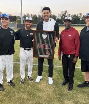 A ex-estrela do Palm Beach Central, Cam Smith, centro, aceita uma camisa emoldurada durante uma cerimônia antes do jogo em 20 de fevereiro. Junto a ele estão, a partir da esquerda, o assistente técnico Lou Todaro, o técnico Christian Benhart, o diretor Reginald Myers e o diretor atlético Travis Abel.