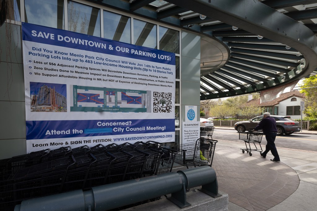Um grupo de líderes empresariais do centro está processando o parque da cidade de Menlo, em Menlo Park, para impedir a redefinida de três estacionamentos pelo menos 345 unidades em moradias populares.