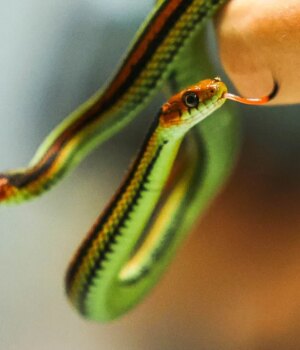 Num edifício extravagante do Zoológico de São Francisco, 115 filhotes de cobras de cores vivas estão sendo engordados com uma dieta de minhocas. Estas são cobras-liga de São Francisco ameaçadas de extinção e durante uma visita no início de dezembro, elas eram pequenas o suficiente para se enrolarem em uma bola na palma da sua mão. Cada um tem uma cabeça laranja-avermelhada, barriga turquesa e listras vermelhas e amarelo-azuladas brilhantes.