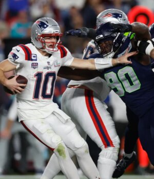 Mas o touchdown final, apropriadamente, veio da defesa de Seattle: Uchenna Nwosu retornou uma interceptação de Drake Maye 45 jardas para um touchdown faltando 4:17 para o fim, uma vez que o chamativo cornerback Rick Woolen acertou Maye no braço enquanto o quarterback do Patriots se afastava do meio-campo Logotipo da NFL.