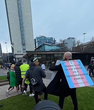 Um vídeo compartilhado no X mostrou dois homens carregando cartazes com os dizeres ‘Proibido bebês transgêneros’ enquanto a Sra. Spencer caminhava pela praça após seu discurso, seguida por seus apoiadores.