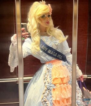 Ryan Woods, conhecido como Lady Maga USA, é famosamente apoiado pelo presidente Trump há anos, mostrando uma grande loira com uma grande peruca loira e uma manifestação com os vestidos do século XIX.