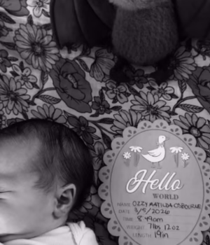 No Instagram na quarta-feira, o casal compartilhou a feliz notícia ao postar uma foto em preto e branco de sua filha, que nasceu no dia 5 de março, ao lado de um cartão de ‘olá mundo’.