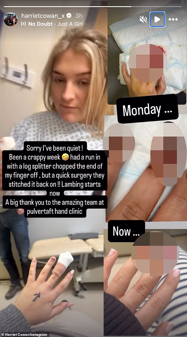 A estrela de Clarkson’s Farm, de 24 anos, compartilhou várias fotos gráficas da lesão antes da cirurgia, incluindo um estalo depois que seu dedo foi costurado novamente, dizendo aos seguidores que ela tinha que ‘correr com um divisor de toras’.