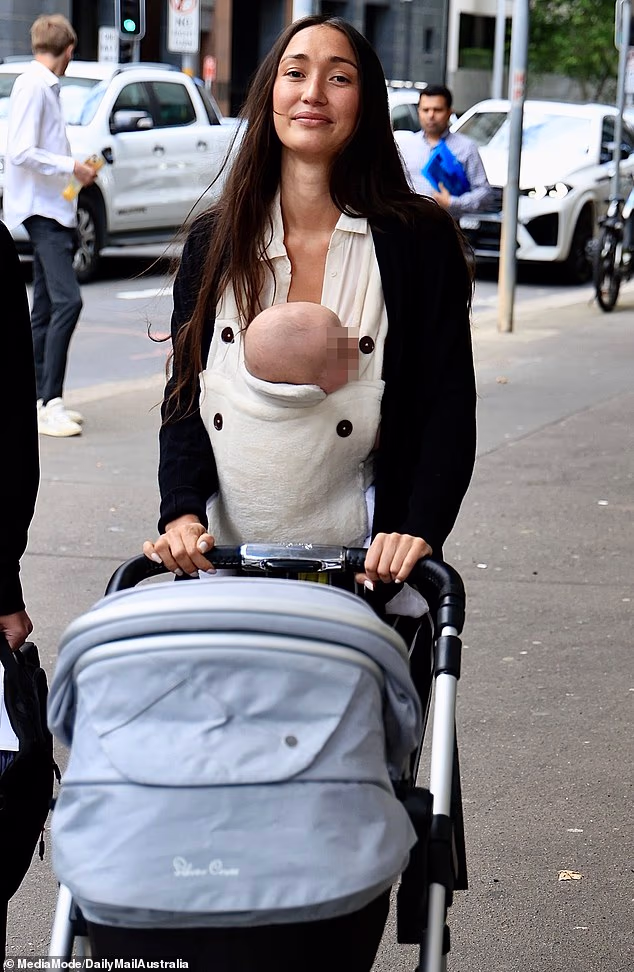 Estelita Huizar, namorada modelo do astro do rock Daniel Johns, chegou ao tribunal na segunda-feira com seu bebê de 14 semanas. O pai da criança é o funcionário do restaurante Andrew Becher, acusado de agredir Huizar.
