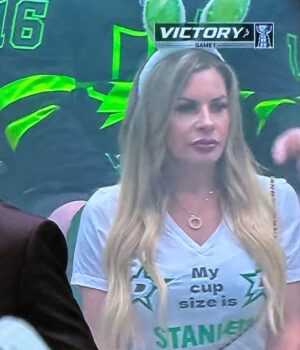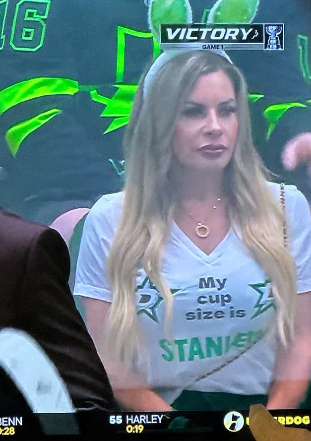 Uma fã da NHL estava sentada logo atrás do banco de estrelas de Dallas, chamou a atenção dos fãs de hóquei com sua camiseta NSFW, que dizia ‘My Size Stanley’.