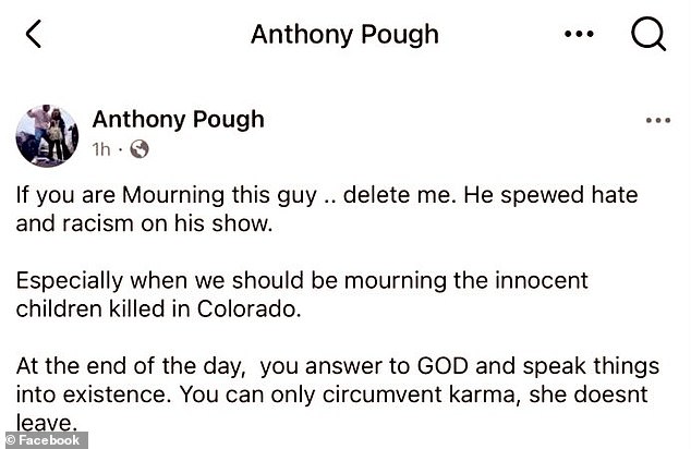 ‘Se você está de luto por esse cara (sic) .. exclua -me. Ele espia o ódio e o racismo em seu programa ‘, escreveu no post do agente, informou pela primeira vez RealPoliticsO