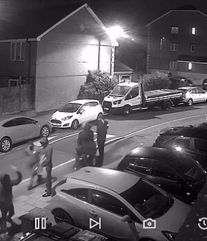 Imagens chocantes da CCTV mostraram que um grupo de oito pessoas estava caminhando em direção à sua casa antes de lançar tijolos para quebrar suas janelas.