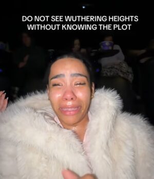 Uma garota filmou sua amiga chorando em um filme sombrio e postou o vídeo no TikTok com a legenda: “Achei totalmente que O Morro dos Ventos Uivantes tivesse um final feliz. Eu realmente pensei que iria ver Margot Robbie e Jacob Ilordi por duas horas.