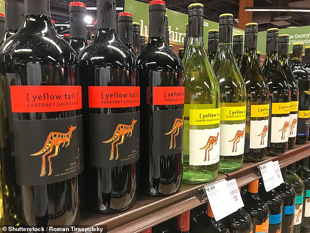 A marca australiana Shiraz, Cabernate Savigonon e Merlot distribuem 13,5 milhões de vinhos todos os anos e são separados por garrafas de vidro preto cobertas de rótulos coloridos com trabalho de arte de canguru.