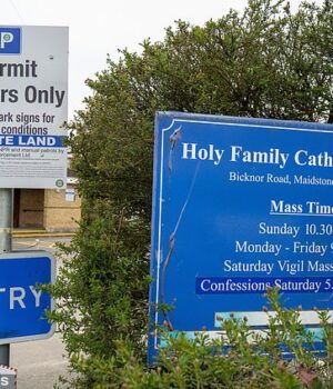 Novos sinais na Igreja Católica da Sagrada Família de Kent’s Maidstone diz que quem estaciona no site, mas não vai à igreja, enfrentará a multa agora