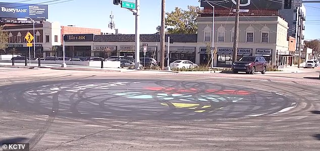 O mural no centro de Kansas City ficou coberto de marcas de pneus após um incidente de corrida de rua