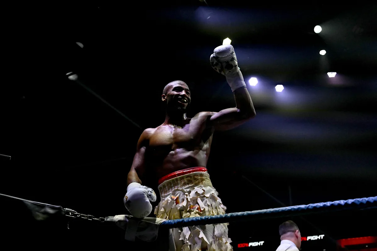 Salahdin Parnas da França comemora sua vitória durante sua luta de boxe contra Franck Petitzin da França na Adidas Arena em 4 de outubro de 2025 em Paris.
