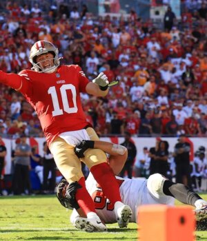Christian McCafrey proporcionou o touchdown de primeira corrida de 49 pessoas em todas as temporadas. Ele marcou um terceiro lance na linha de uma jarda, mantendo o jogo diante de 49 pessoas por cinco minutos. No entanto, McCafrey tinha apenas 54 jardas (17 Carrie) com mais gaze (57) mais gaze como receptor. Brian Robinson Jr. e Isaac Gerando não carregavam; Jones converteu duas corridas curtas de jardas.