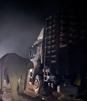 Uma mãe triste elefante estava desesperada para tentar remover o caminhão que matou sua panturrilha