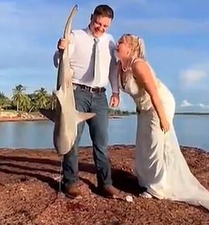 Em seu longo vestido branco e salto alto, o pescador interessado abriu seu tubarão pela primeira vez quando sua alegre noiva e convidados viram.