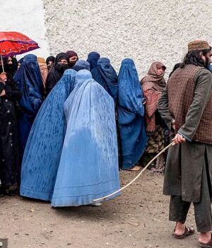 Um segurança talibã monta guarda enquanto mulheres afegãs vestidas de burca esperam na fila