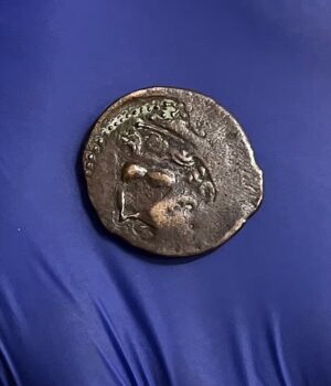 Um dos lados da moeda apresenta o rosto do deus Melkert, semelhante ao herói grego Hércules e usando seu famoso cocar de pele de leão.