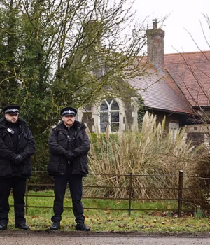 Policiais do lado de fora de Wood Farm, na propriedade Sandringham, no dia em que Andrew foi preso