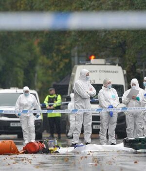 As equipes forenses trabalham no local de uma facada na sinagoge em Mandal Hebraico na quinta -feira
