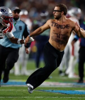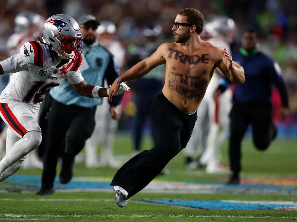 O incidente mais marcante do grande jogo foi o jogador do Super Bowl, que entrou em campo por volta das 6h30 e foi perseguido por vários seguranças e até por um jogador. O homem foi capturado pelos guardas antes de ser levado às pressas para fora do campo. Esse homem e um segundo que invadiu um campo ao mesmo tempo foram presos sob suspeita de invasão, segundo o registro.