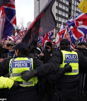 Seis pessoas foram presas após o início da violência entre manifestantes de direita e contra-manifestantes no centro da cidade de Manchester.
