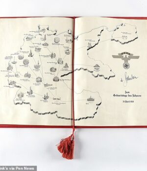 Um fólio luxuoso que foi oferecido a Adolf Hitler em seu 49º aniversário está pronto para trazer mais de US $ 12.000 ao leilão. Possui um mapa da Alemanha com a Áustria em anexo