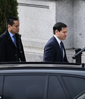 O secretário de Estado dos EUA, Marco Rubio (R), chega ao Eisenhower Executive Office Building, no campus da Casa Branca, antes de uma reunião agendada com o vice-presidente dos EUA, JD Vance, o dinamarquês Lars Loke Rasmussen e a ministra das Relações Exteriores da Groenlândia, Vivian Motzfelt, em Washington, DC, 14 de janeiro de 2012.