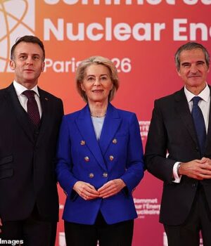 Emmanuel Macron, Ursula von der Leyen e Rafael Grassi, Diretor Geral da Agência Internacional de Energia Atômica (AIEA) posam durante a Cúpula de Energia Nuclear