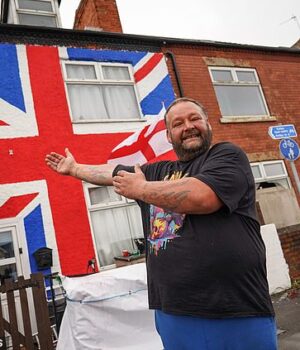 Simon Broccolarst passou 12 horas de reboco uma bandeira enorme em suas quatro casas de cobertura, que os habitantes locais têm medo de temer que o preço da propriedade nessa região seja reduzido