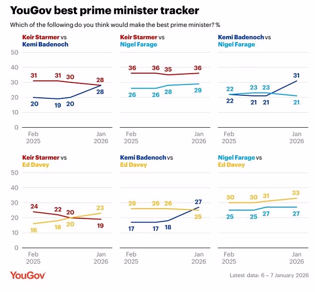 Badenoch também está agora à frente do líder liberal democrata, Sir Ed Davey, para se tornar primeiro-ministro por 27% a 25%.