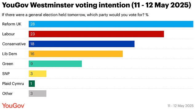 A Yugov Research Nigel Farage caiu a festa em 20 % – uma desde a semana passada. Ambos alcançaram uma conquista para atingir 23 % com as duas alterações no intervalo de intervalo.