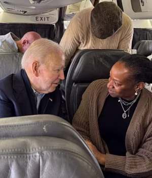 Uma mulher morena parou no assento de Biden na primeira classe, dizendo-lhe ‘obrigado por reservar um tempo para falar comigo’.