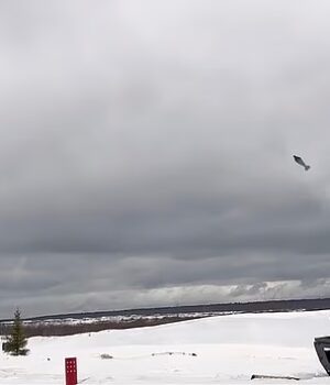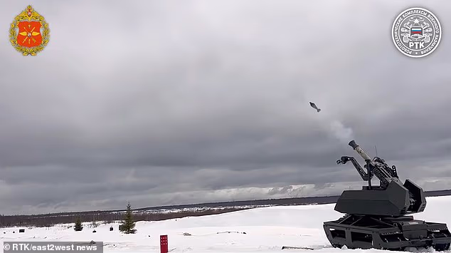 No vídeo, o robô atarracado e rastreado é visto girando sua torre sobre um campo de neve antes de disparar uma série de tiros de morteiro de 82 mm contra um alvo de treinamento distante.