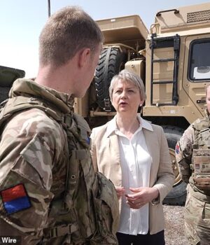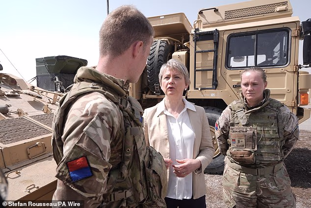 A secretária de Relações Exteriores Yvette Cooper durante uma visita a uma base militar britânica perto de Riad, Arábia Saudita, em 13 de março