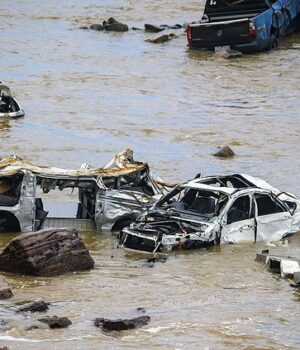 Vários carros ficaram presos nas ondas enquanto as autoridades estimavam que entre 10 e 20 veículos foram perdidos.